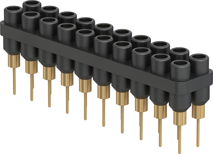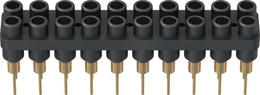 20-polige Buchsenleisten, bestehend aus 2 Reihen je 10 starren Buchsen mit Lötanschluss. Keine Einzelmontage der Buchsen nötig. Vereinfachte Panelbohrung, Orientierung der Lötanschlüsse und kompakte Montage mit nur 5 Schrauben. Steckweite 6 mm.