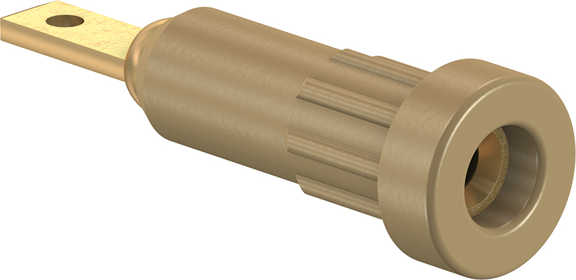 Isoliert, starr, Ø 2 mm aus gedrehtem Messing. Montage durch Einpressen in Bohrungen von Platten oder Gehäusen aus Kunststoff, Metall etc. Flachstecker 2,8 mm x 0,8 mm.