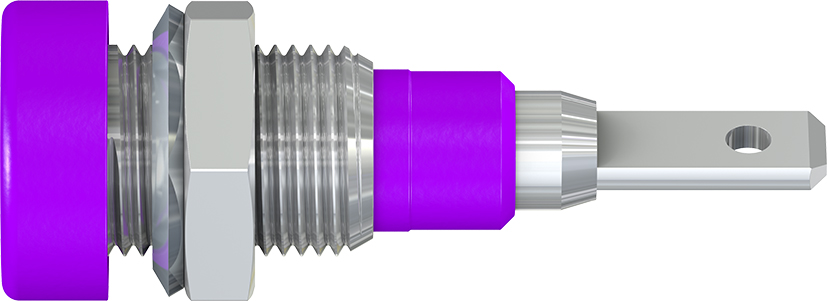 Isoliert, Ø 2 mm mit federnder MULTILAM. Messingdrehteil. Metallgewindehülse auf der Isolierung. Montage durch Festschrauben in Bohrungen von Platten oder Gehäusen. Flachstecker 2,8 mm x 0,8 mm.
