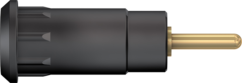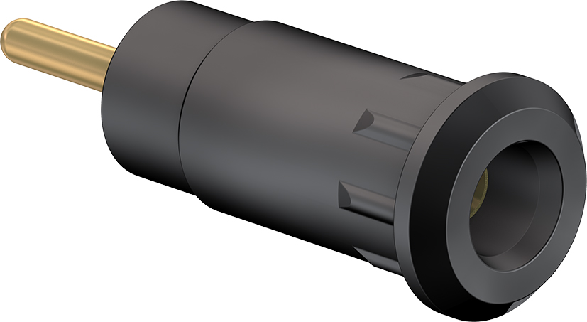 Isoliert, starr, geeignet zur Aufnahme federnder Ø 2 mm-Stecker mit starrer Isolierhülse. Montage durch Einpressen in Bohrungen von Platten oder Gehäusen aus Kunststoff, Metall etc. Rundstift Ø 1,9 mm.