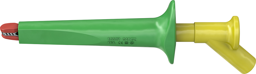Klauenpaar aus Stahl zum Abgreifen von Stromleitern. Zur erhöhten Sicherheit bei der Kontaktierung ist das Klauenpaar außen isoliert. Starre Ø 4 mm-Buchse im Drückerteil, geeignet zur Aufnahme federnder Ø 4 mm-Stecker mit starrer Isolierhülse.