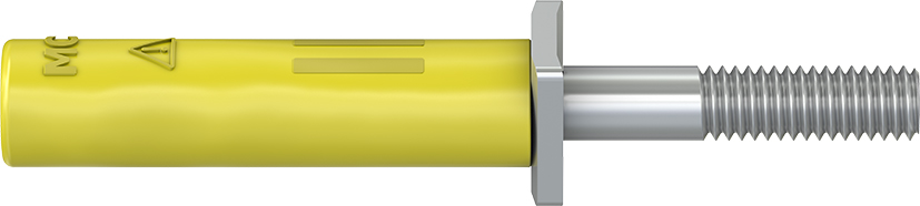 Isoliert, mit M3,5-Außengewinde für die Kontaktierung von Reihenklemmen mit M3,5-Gewindebohrungen. Messingdrehteil. Starre Ø 4 mm-Buchse im Isolierkörper, geeignet zur Aufnahme federnder Ø 4 mm-Stecker mit starrer Isolierhülse. Buchse mit Innenschlitz für Schraubendreher.