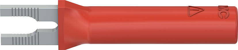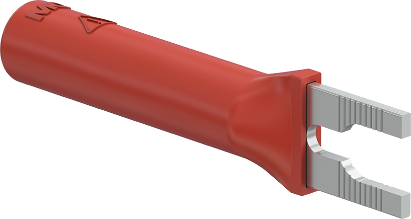 Aus Messing, zur festen Kontaktierung z. B. von Schraubklemmen. Starre Ø 4 mm-Buchse im Isolierkörper, geeignet zur Aufnahme federnder Ø 4 mm-Stecker mit starrer Isolierhülse. Anschlussgabel einmalig bis 90° abbiegbar.
