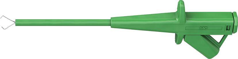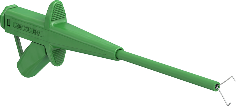 Federdrahtklammer aus Edelstahl in flexiblem Schaft für das Umfassen von Stiften und Drähten an schwer zugänglichen Stellen. Besonders geeignet für Spannungsabgriffe. Die Silikon-Isolierung des Schaftes gewährleistet gute Hitzebeständigkeit und Flexibilität auch bei extremer Kälte. Starre Ø 4 mm-Buchse im Griffteil, geeignet zur Aufnahme federnder Ø 4 mm-Stecker mit starrer Isolierhülse.