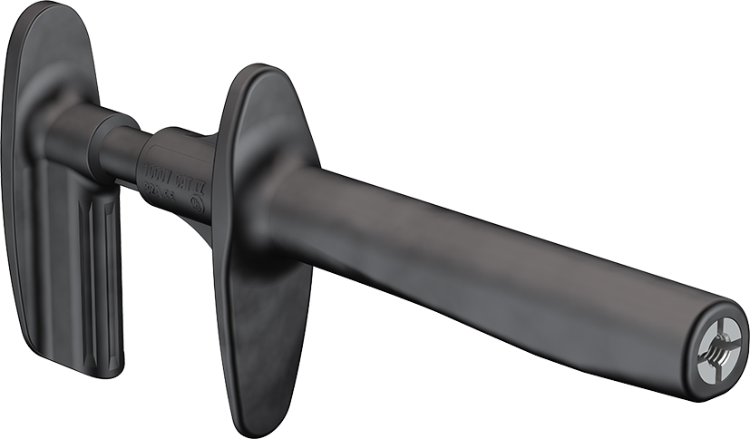 Zur schnellen und sicheren Kontaktierung von Schraubbolzen M6, z. B. an Motorenanschlüssen (Einstecktiefe 3 – 6 mm). Starre Ø 4 mm-Buchse im Drückerteil, geeignet zur Aufnahme federnder Ø 4 mm-Stecker mit starrer Isolierhülse. Gewindeeinsätze sind auswechselbar und separat erhältlich. Die Stromstärke ist abhängig vom Gewindeeinsatz.