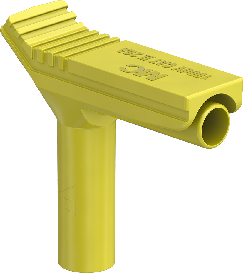 Isoliert, aus Messing. Ø 4 mm-Lamellenstecker mit starrer Isolierhülse und starre Ø 4 mm-Buchse, geeignet zur Aufnahme federnder Ø 4 mm-Stecker mit starrer Isolierhülse. Dieser Winkel-Steckadapter ist besonders geeignet, um bei Messgeräten mit frontseitig montierten Buchsen die Messleitung ergonomisch einwandfrei wegzuführen.